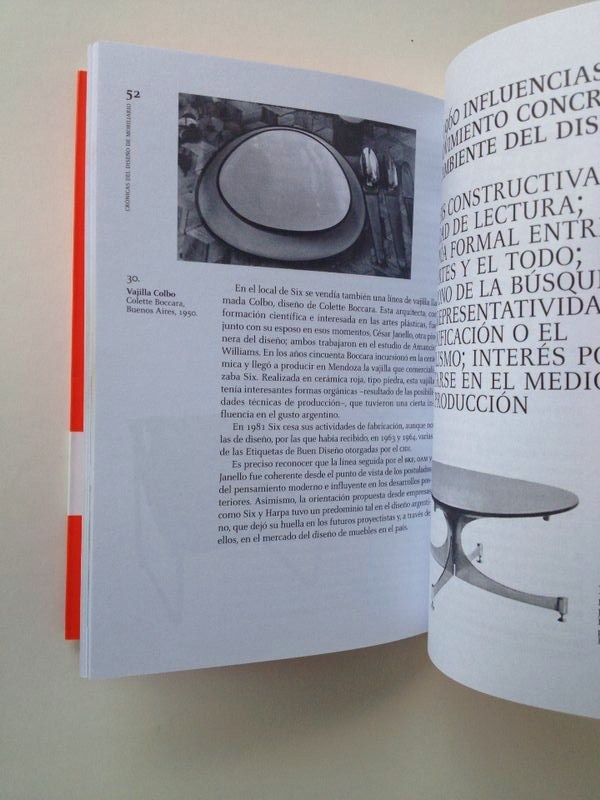 "......En el local de Six se vendía también una linea de vajilla llamada Colbo, diseño de Colette Boccara. Esta arquitecta, con formación científica e interesada en las artes plásticas, fue junto a su esposo en esos momentos, César Jannello, otra pionera del diseño; ambos trabajaron en el estudio de Amancio Williams. En los años cincuenta Colette incursionó en la cerámica roja, tipo piedra, esta vajilla tenía interesantes formas orgánicas-resultado de las posibilidades técnicas de producción-, que tuvieron cierta influencia en el gusto argentino...."