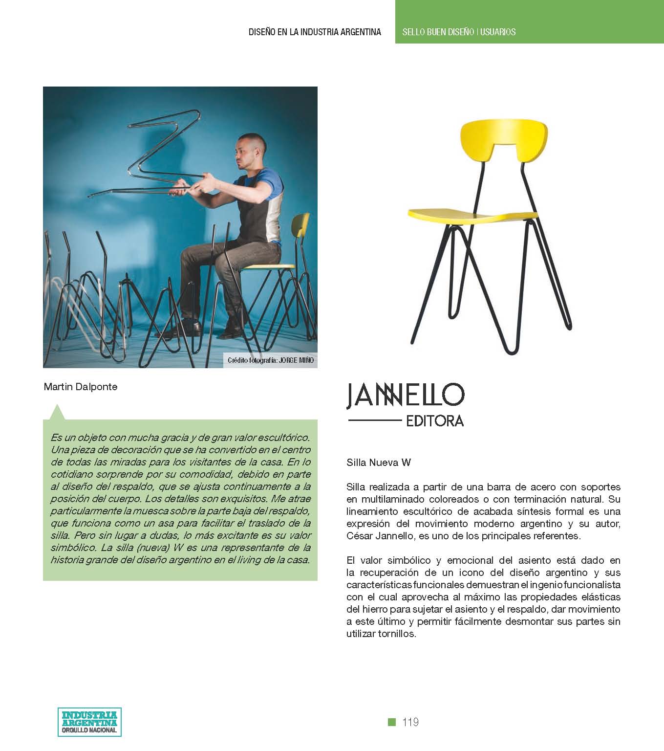 "Es un objeto con mucha gracia y de gran valor escultórico. Una pieza de decoración que se ha convertido en el centro de todas las miradas para los visitantes de la casa. En lo cotidiano sorprende por su comodidad, debido en parte al diseño del respaldo, que se ajusta continuamente a la posición del cuerpo. Los detalles son exquisitos. Me atrae particularmente la muesca sobre la parte baja del respaldo, que funciona como un asa para facilitar el traslado de la silla. Pero sin lugar a dudas, lo más excitante es su valor simbólico. La silla (nueva) W es una representante de la historia grande del diseño argentino en el living de la casa."